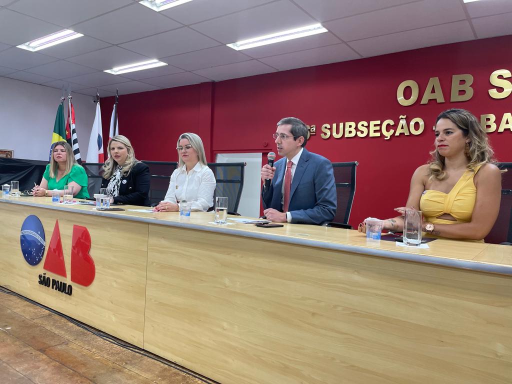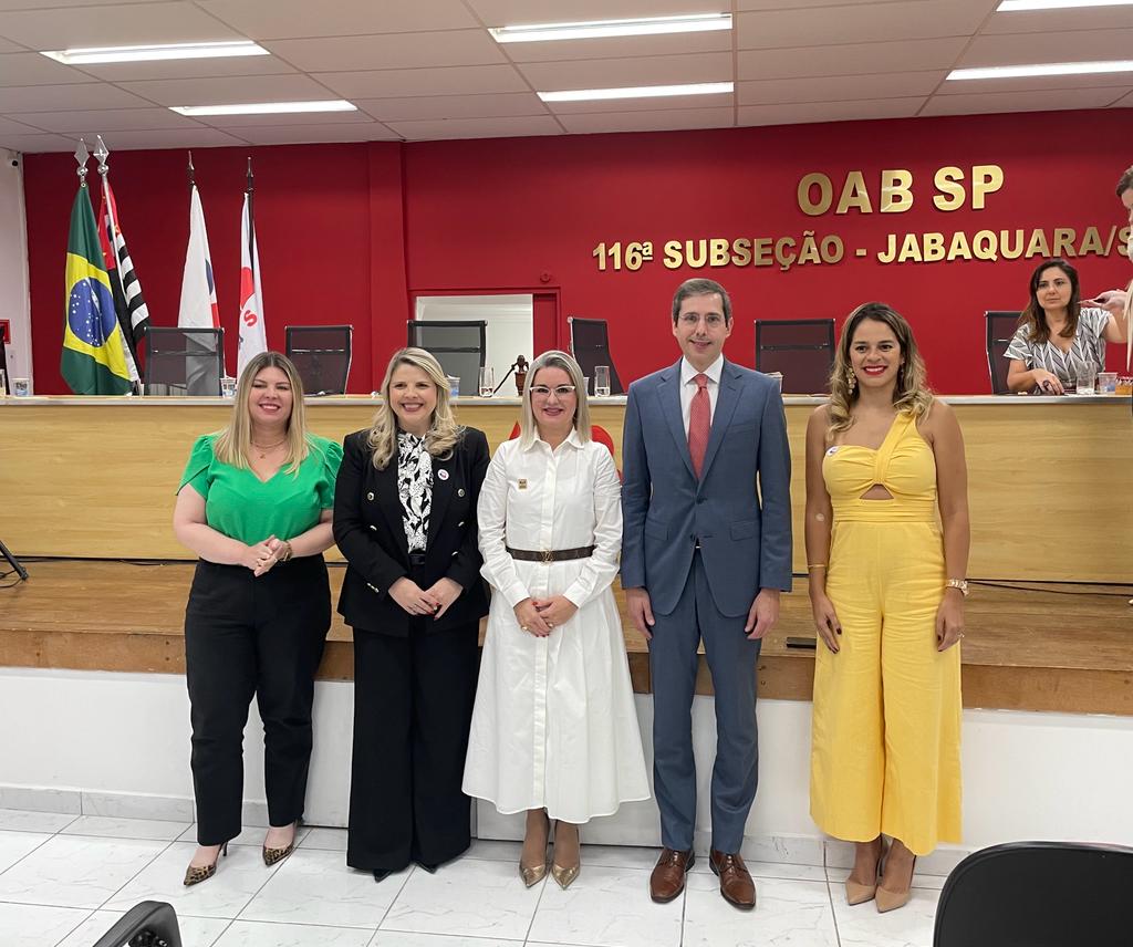 Compuseram a mesa solene dos trabalhos: Cindia Moraca, Presidente da Comissão da Mulher Advogada; Alessandra Algarin, Presidente Estadual do Podemos Mulher; Terezinha Fernandes, Presidente da Subseção de Jabaquara; Eduardo Mange, Presidente da AASP; e Cláudia Trajano, Coordenadora do Núcleo de Práticas Jurídicas da Faculdade Anhanguera.